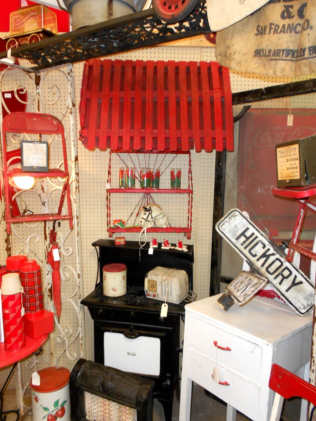 I was telling someone last week that our sales in the red booth had slowed down...and that is usually a signal that it is time for a booth re-do. So Mom and I spent the day rearranging and bringing in some new stuff. I have since had to rearrange twice as the sales have been GREAT! It is amazing what a little freshening up can do. I went in this afternoon to fill in some holes and decided I better post pics ASAP before they change again. I LOVE the red industrial stuff. I was chatting with the girls over at Three Ring Cottage and they asked if this is what my house looked like. It actually doesn't, so maybe this is why I love buying stuff for and decorating this booth...it is an outlet for me!